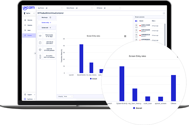 UXCamでアプリ内全てのページを総合的に理解できます。ユーザーが最も時間を費やすページ、頻繁にクラッシュするページ、各ページ間のユーザーの流入・流出状況を確認できます。