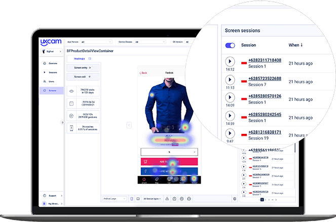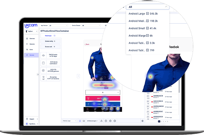 ヒートマップ上で、ユーザーがどこをタップし、何を無視し、どこでイライラしたのか。 典型的な使用パターンを認識し、ユーザー行動の重要な要素を一目で判別できます。どのCTA(行動喚起)がうまく機能したか、また機能していないCTAは何なのかを理解できます。