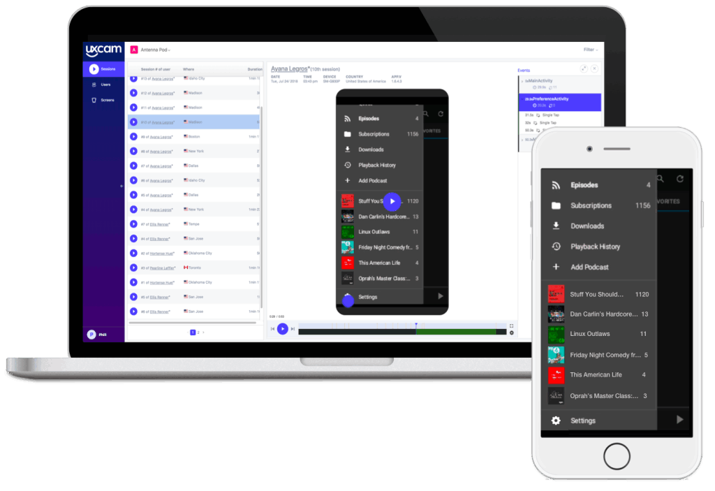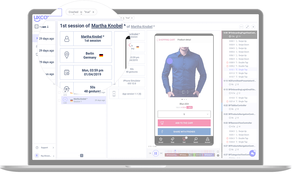 UXCamはクラッシュしたセッションを自動的に検出し、トラブルシューティングの時間を節約します。